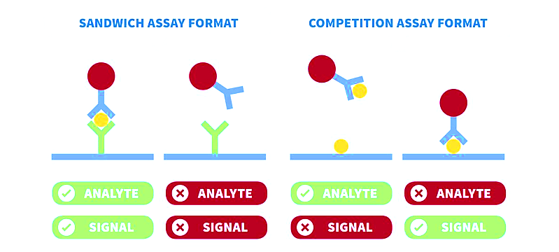 معمولا برای تشخیص آنالیت های بزرگ که حداقل دو محل یا اپیتوپ اتصال دارند. معمولا یک آنتی بادی با نانو ذرات مزدوج شده و آنتی بادی دیگر روی خط تست قرار دارد. اگر آنالیت در نمونه حاضر باشد، به هر دو آنتی بادی ها متصل خواهد شد و پاسخ تست مثبت می شود. شدت سیگنال در خط تست در این قالب با غلظت آنالیت متناسب است.